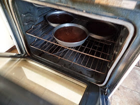 Divide batter into three pans, and bake about 350 degrees for 35 minutes.